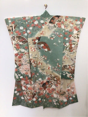 振袖 薄緑 扇面 花鳥 金銀彩 染め分け[4570191712151]