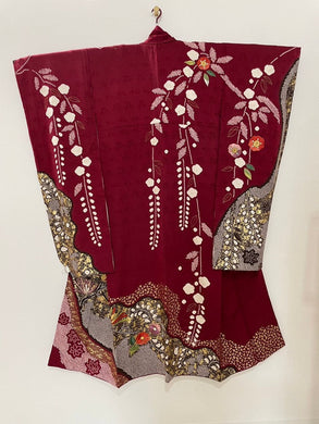 振袖 赤 黒 絞り ゴールド箔 花車 流水 芍薬 藤 菊 枝垂れ桜