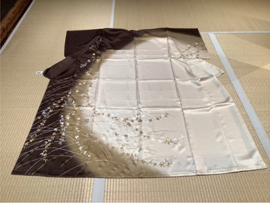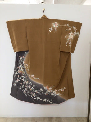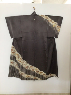 訪問着 ダークブラウン ゴールド オフホワイト 蝶(螺鈿) 枝垂れ草 露芝