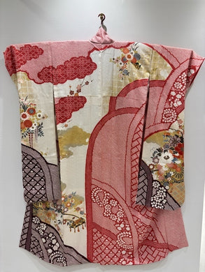 訪問着 ピーチピンク ライトグレー ゴールド 芍薬 菊 ポピー 白鳩