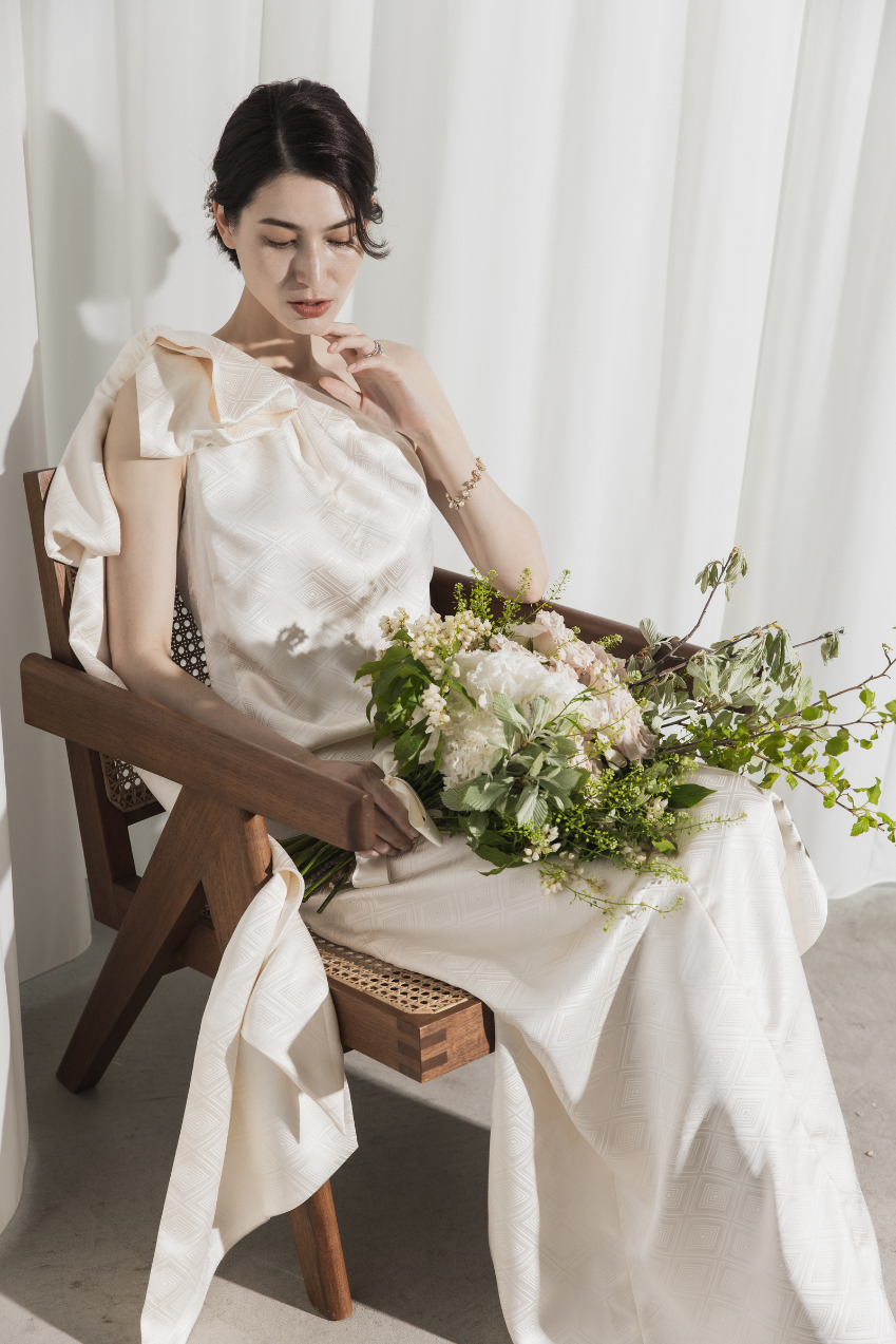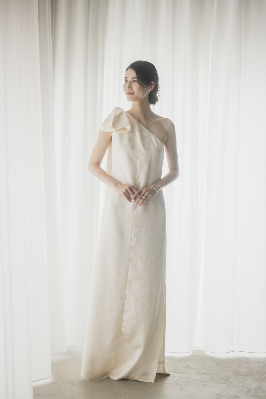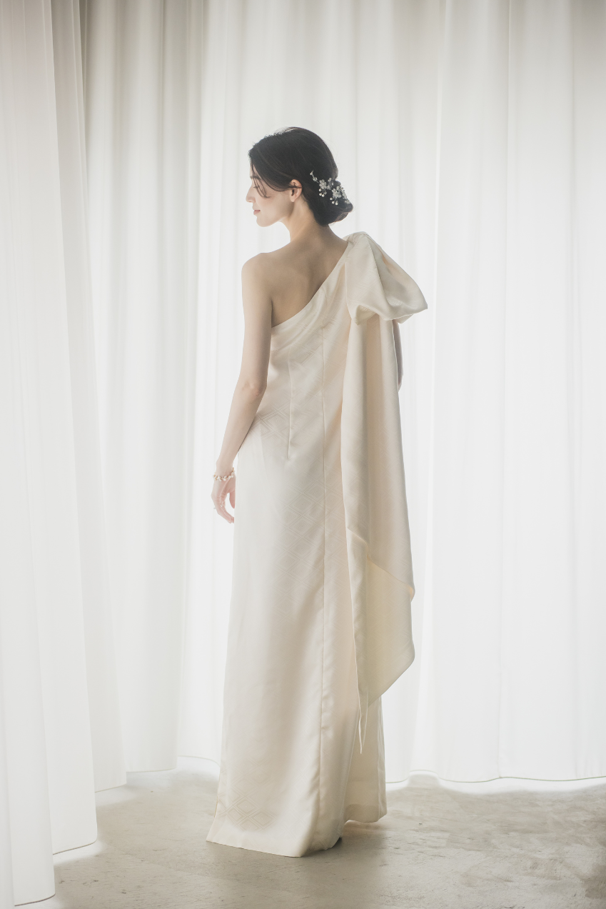 ワンショルダーで肩に大きなリボンがデザインポイントの